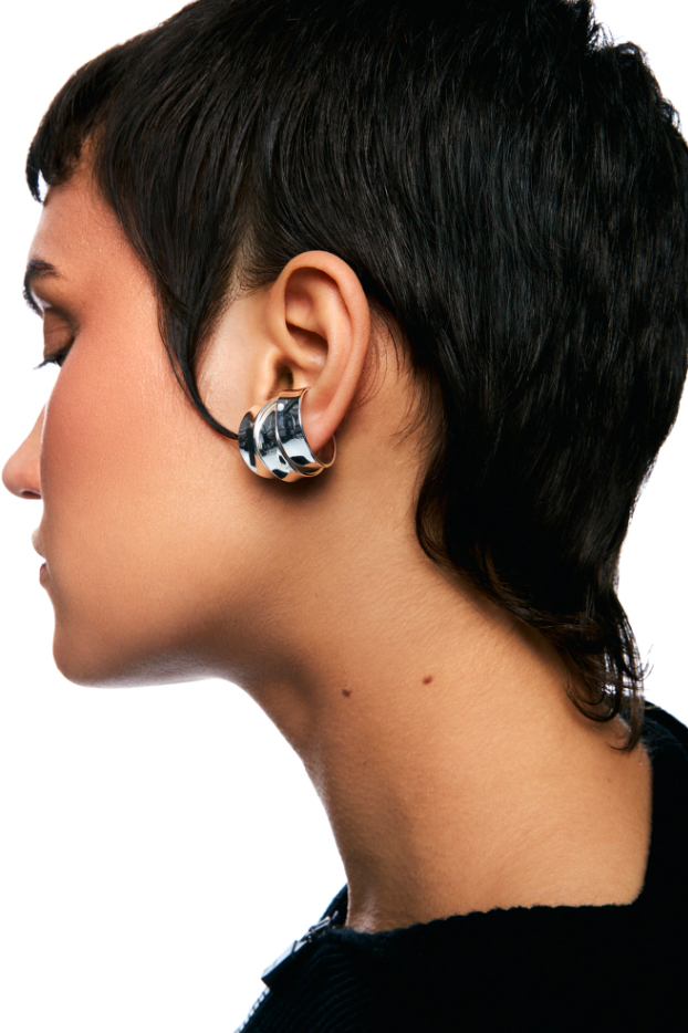 Featuring three thin ribbons of 7 mm with a combined width of 19 mm, this small ear cuff showcases exceptional craftsmanship through its polished finish and intertwined design. Measuring 17 mm in height, this lightweight piece (4.5 gr) sits perfectly on your ear.