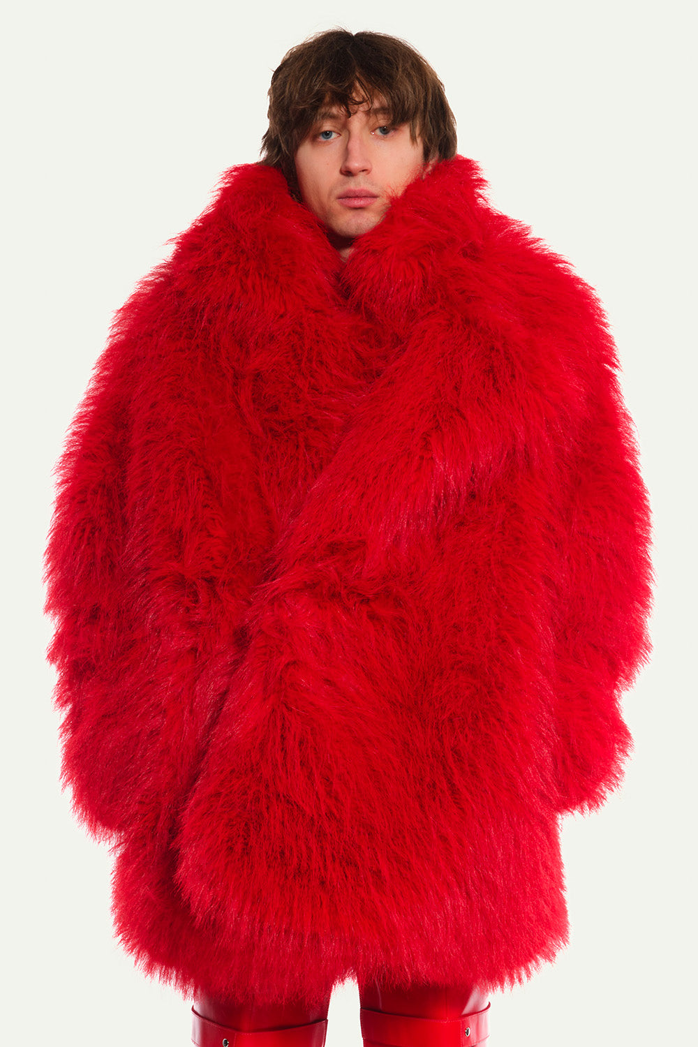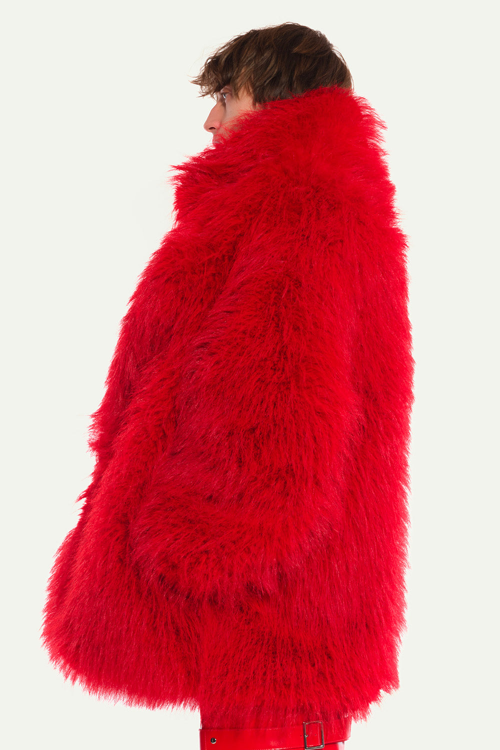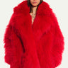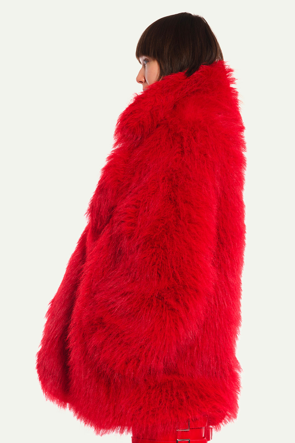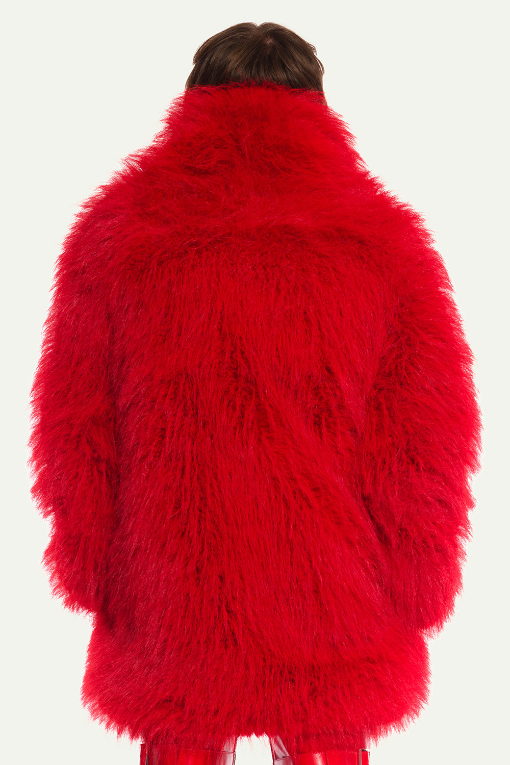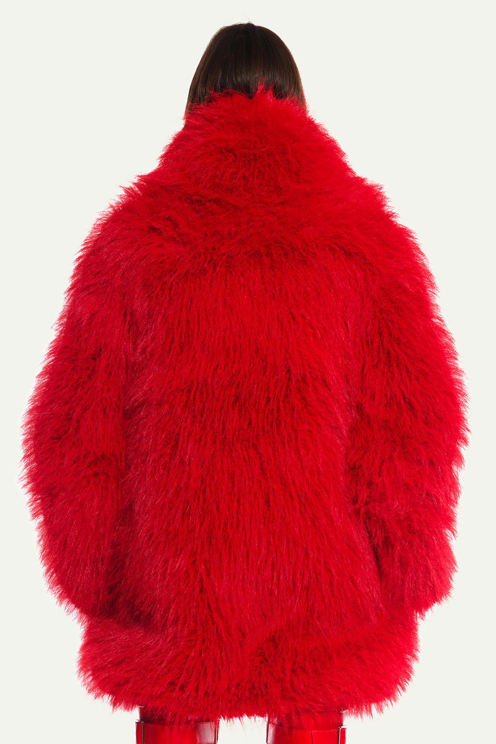 Red Long Fake Fur Coat with Pockets and a Red Quited Lining