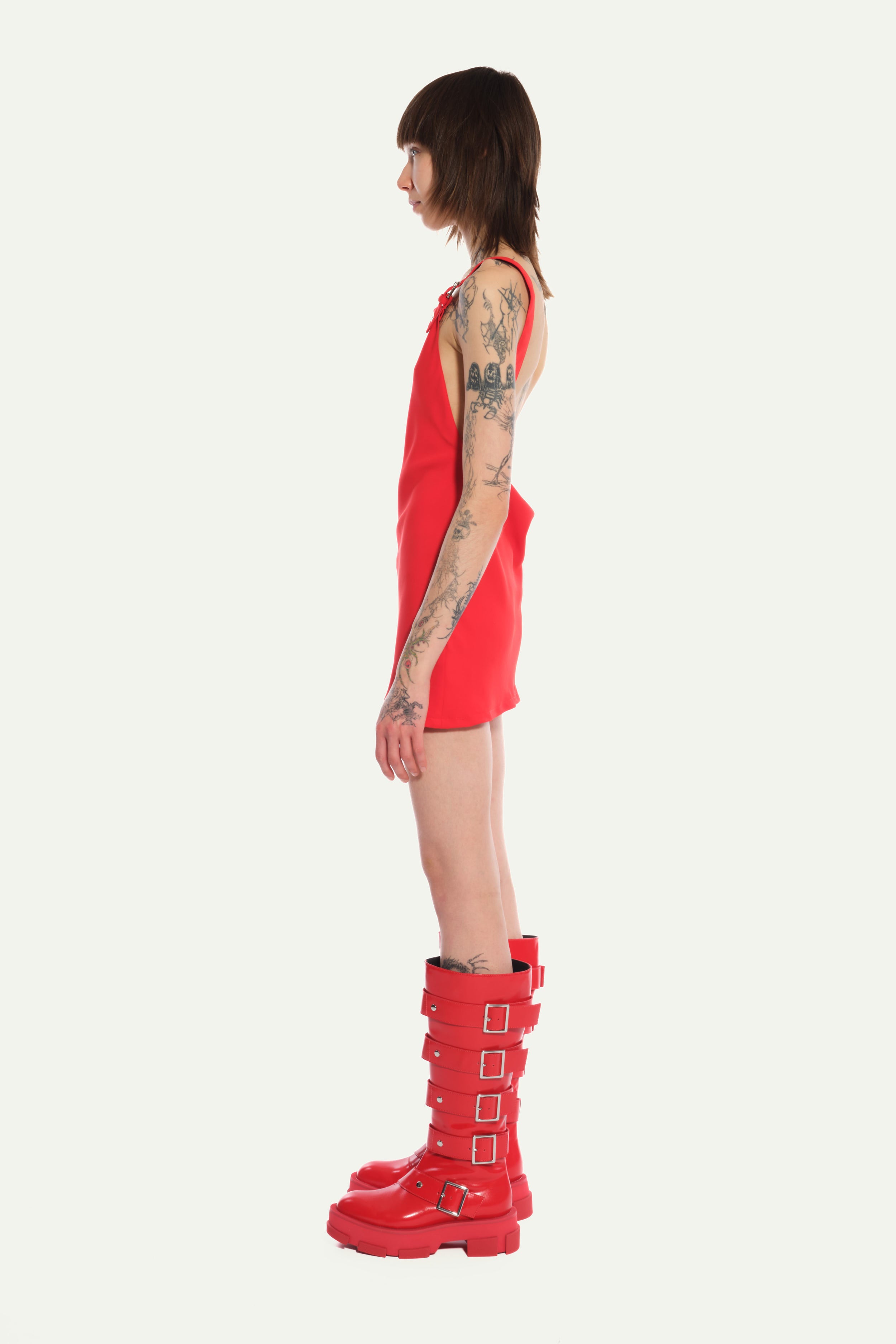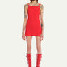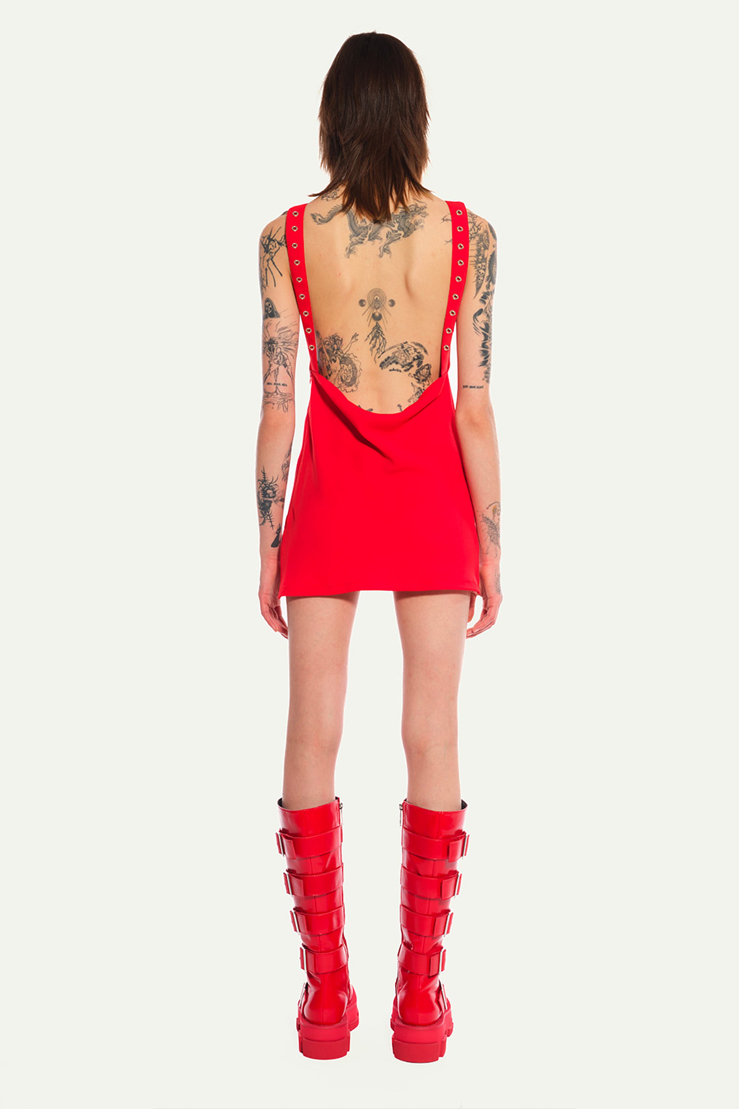 Red Short Dress in Mat Satin cut in biais, with eyelets braces
