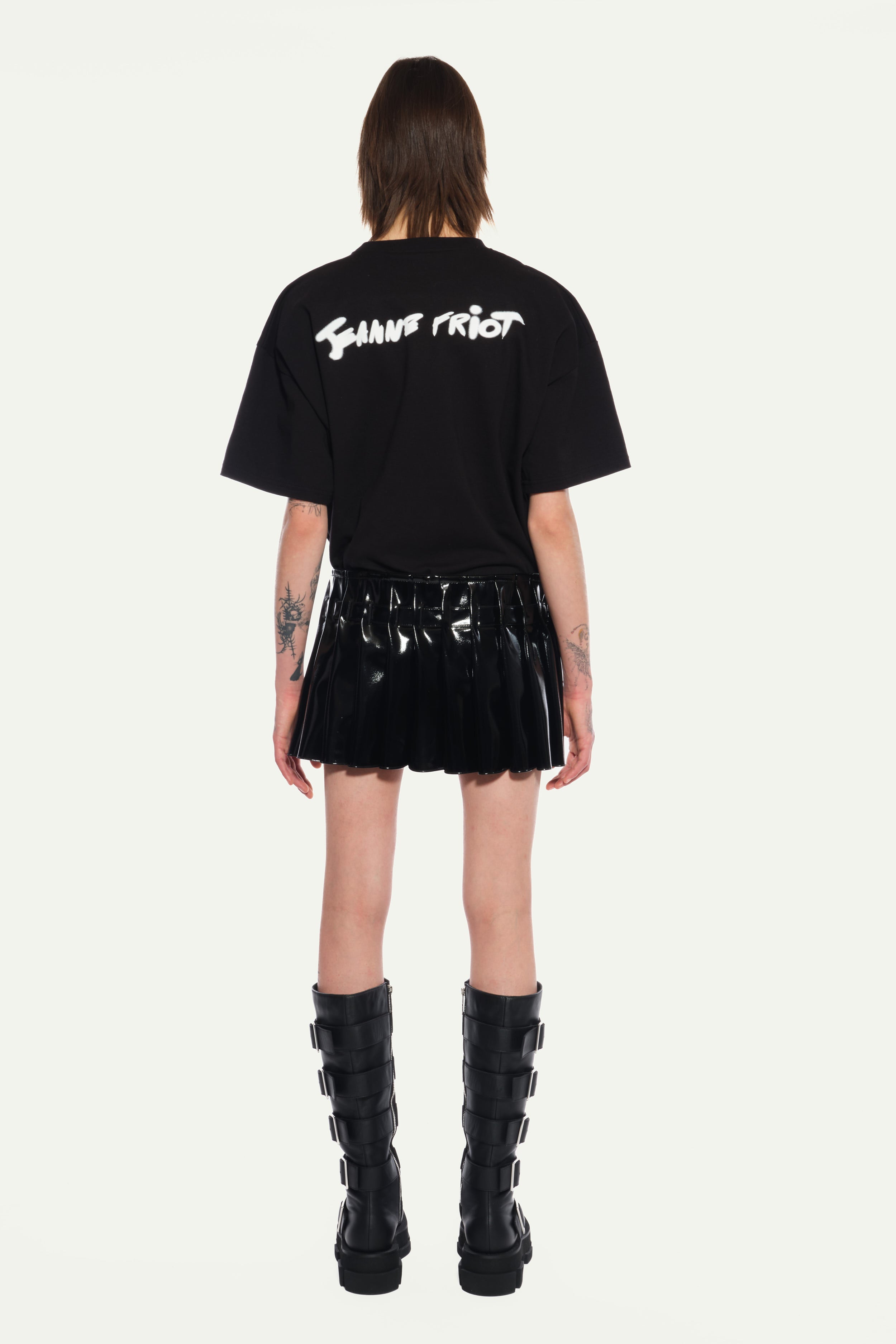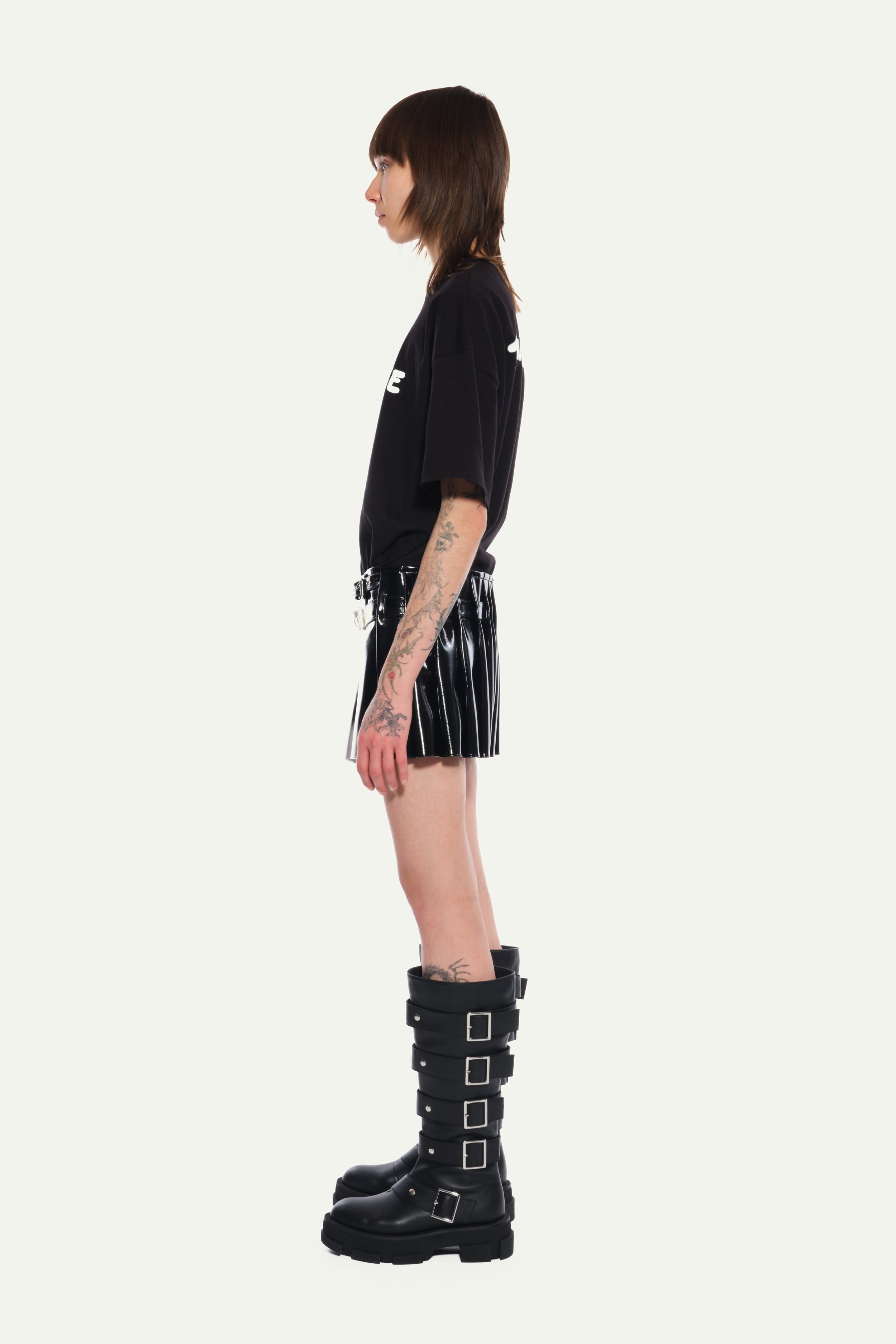 Black Pleated Mini Kilt in Vinyl with Belts Details Layered in Black Polyester