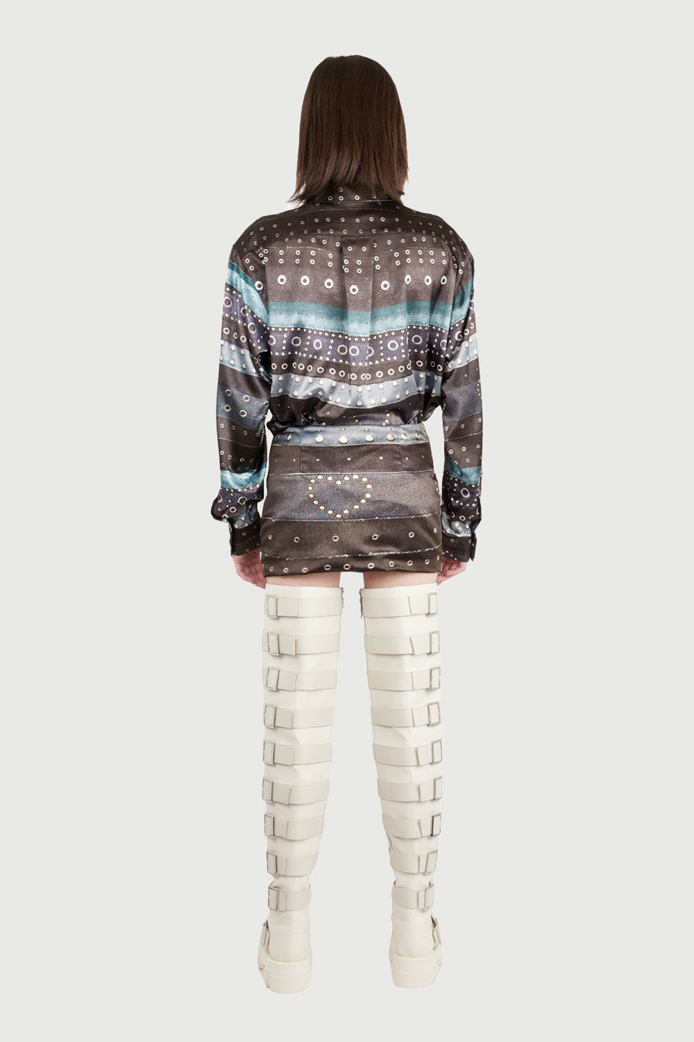 Mini Belt Skirt Printed in White Satin with Denim Belts Print